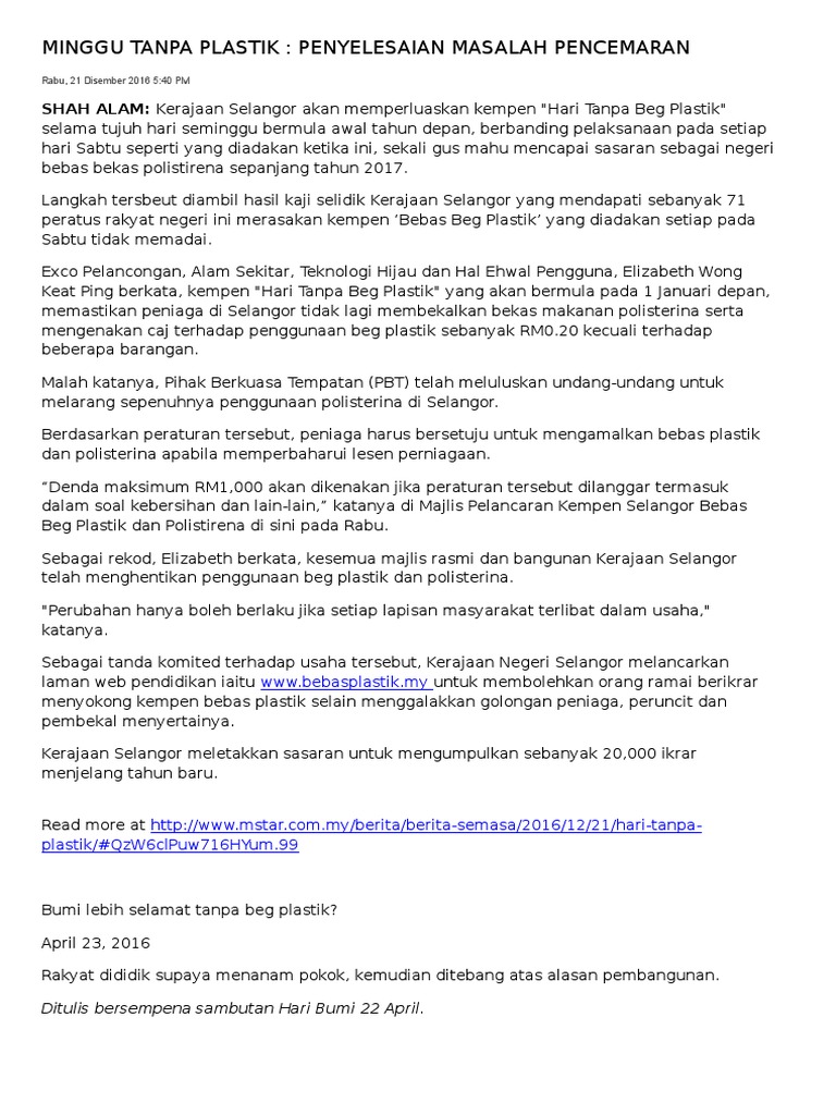 •hari tanpa beg plastik pada asalnya dilaksanakan pada hari isnin tetapi berdasarkan kepada maklumbalas positif yang diterima ianya telah ditambah ke tiga hari iaitu pada hari isnin, selasa dan rabu bermula 1 januari 2010. Melalui usaha mereka, kita telah berjaya mengurangkan lebih dari 4 juta beg plastik pada tahun lepas. Kempen memelihara alam sekitar lain adalah dengan mengurangkan penggunaan bahan plastik oleh setiap pengguna. Hampir 1 trilion beg plastik digunakan setiap tahun di seluruh dunia. Di malaysia beg plastik menjadi keperluan masyarakat terutama analisis rangkaian sosial terhadap pemain utama dalam memperkasakan kempen bebas beg plastik di kuantan pahang. Di malaysia, usaha untuk mengurangkan penggunaan plastik telah bermula dengan kempen hari tanpa beg plastik. Pendedahan tentang kesan penggunaan beg plastik mesti dilaksanakan secara holistik supaya. Malah, penguatkuasaan peraturan ini juga bermaksud tiada penggunaan straw dan polisterin di kedai makan secara percuma. Rekod inventori bulanan unit penggunaan beg plastik. Bahagian perkhidmatan farmasi, kementerian kesihatan malaysia. Kumpulan alam sekitar juga bimbang dengan kurangnya inisiatif oleh pengeluar minuman ringan dalam pengurusan penggunaan dan pembungkusan plastik serta kesan terhadap. Bermula 1 januari 2017 hari tanpa beg plastik yang sebelum ini diadakan setiap hari sabtu di selangor akan dipanjangkan kepada 7 hari seminggu. Kempen hari tanpa beg plastik ini amat berjaya sehingga kerajaan persekutuan mengikuti jejak langkah kerajaan negeri selangor melalui kempen yang serupa di seluruh negara.