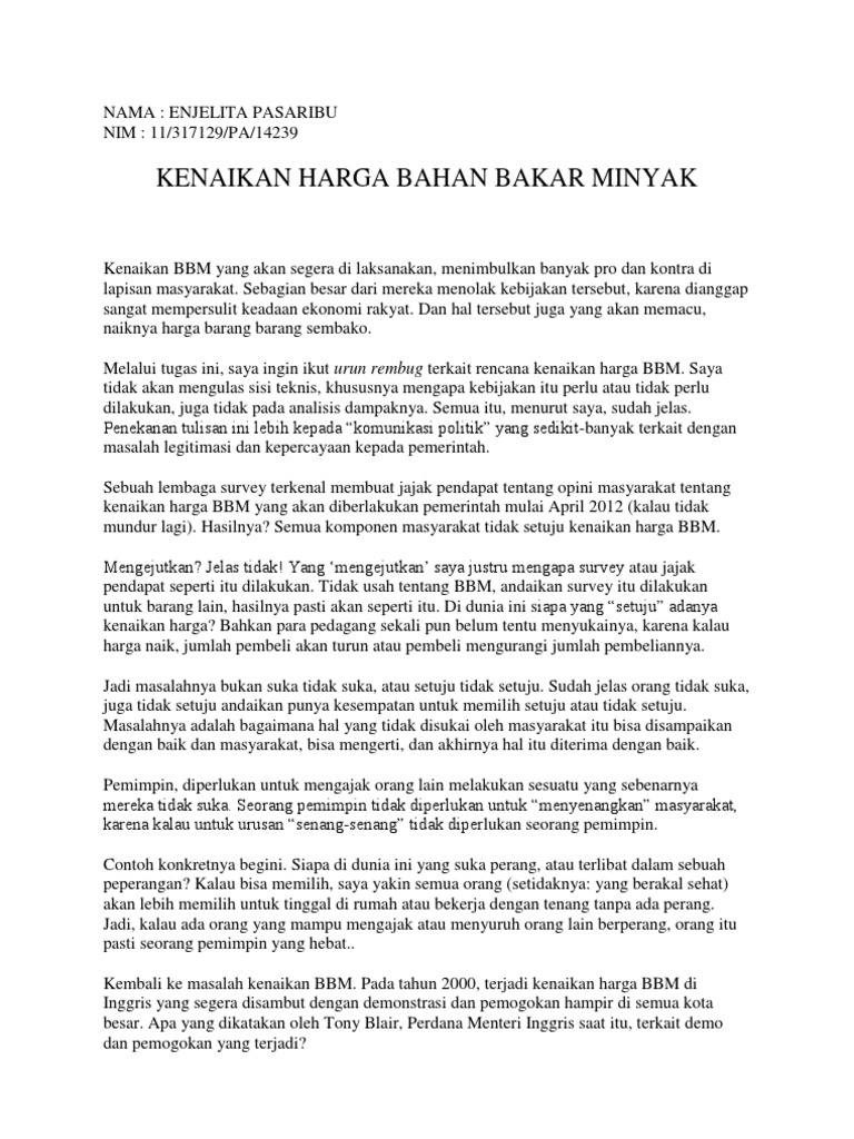 Salah satu masalah terbesar yang muncul dari dinaikkannya harga bbm adalah kekhawatiran akan terhambatnya pertumbuhan ekonomi karena dampak kenaikan harga barang dan jasa yang terjadi akibat komponen biaya yang naik. Berikut salah satu contoh adanya kenaikan harga barang produksi sebuah perusahaan. Kenaikan harga bahan bakar minyak (bbm) nonsubsidi atau jenis bbm umum (jbu) di sumatera utara (sumut) membuat. Bagi sesetengah pihak pula, janganlah. Saya juga berharap agar masalah kenaikan harga barang tidak akan membebankan tanggungan ibu bapa.